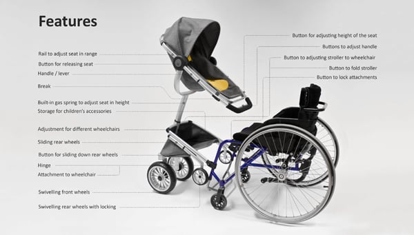 Cursum, un concept de poussette adaptative pour fauteuil roulant développé par Cindy Sjöblom dans le cadre de sa thèse de licence à l’Umeå Institute of Design
