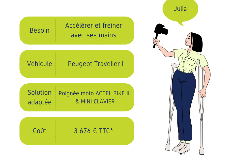 Pour permettre à Léa, privée de l’usage de ses jambes, de conduire en accélérant et en freinant au volant, notre atelier de Jallais a équipé son véhicule Peugeot Traveller I d’un poignée moto ACCEL BIKE II avec MINI CLAVIER (en option) et d’un STOPDIS II. Une boule en carbone d’aide à la direction et son support complètent cet aménagement d’un coût total de 3676 € TTC. Ce tarif peut évoluer, il comprend la pose et est applicable uniquement dans notre atelier de Jallais.