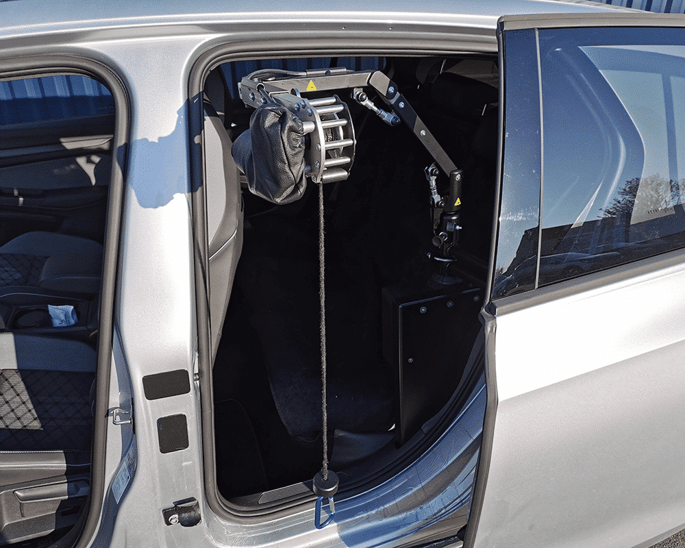 - Le treuil chargeur de fauteuil est installé au niveau de la banquette arrière. Il charge le fauteuil roulant plié et le descend à proximité du poste de conduite.